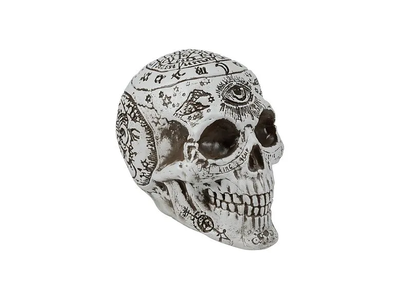Geheimnisvolle Runen und Symbole bedecken nahezu den kompletten Totenschädel und jede dieser Linien und Kurven scheint mit besonderen Kräften und Magie geladen zu sein. Welche Geschichten und Mysterien verbirgt er? Stammt er aus der Welt der Druiden, der Majas...