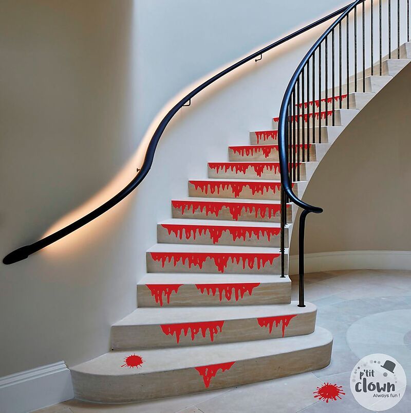 Der absolute Horror! Blutspuren auf der langen Treppe, die man selber zuschneiden kann. Diese Packung enthält total 16 Teile: 8 x 98 cm 2 x 29 cm 2 x 22 cm 1 x 38 cm 1 x 45 cm 2 x 10 cm runde Blutflecken sowie 2 doppelseitige Klebebänder, damit diee Blutspuren...