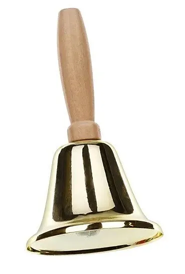 Weihnachtsmann-Glocke in Gold mit Holzgriff, Glockendurchmesser ca. 6,3 cm, Gesamthöhe 11 cm.