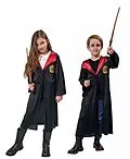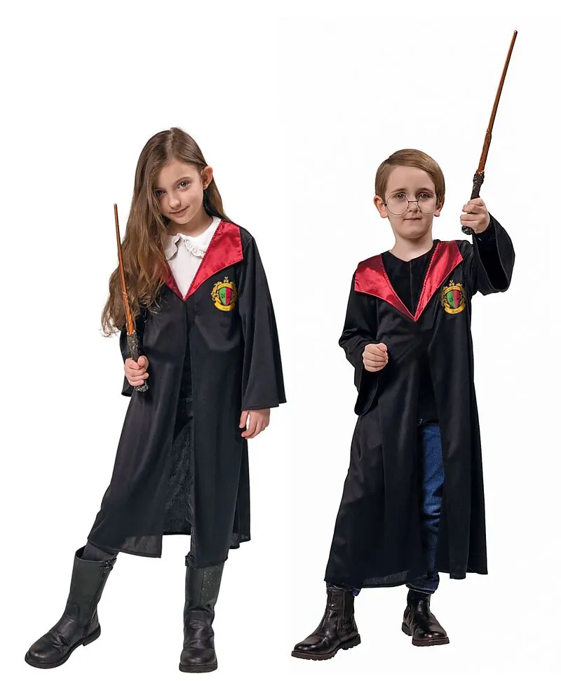 Grösse 104/116 Schwarzes Kostüm für Zauberschüler und Zauberschülerinnen. Die langärmelige Zaubererrobe hat einen seidig glänzenden, roten Kragen vorne sowie ein großes aufgedrucktes Emblem auf der Brust. Sie wird mit einem Klettpunkt am Halsausschnitt verschl...