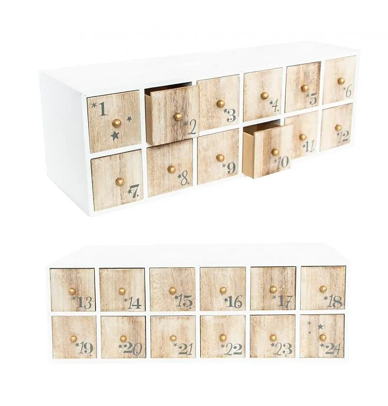 Vorderseite/Rückseite mit Holzschubladen 1-24 40,5 x 13,5 x 14cm toller Adventskalender, wiederverwendbar, ein süsser Hingucker!