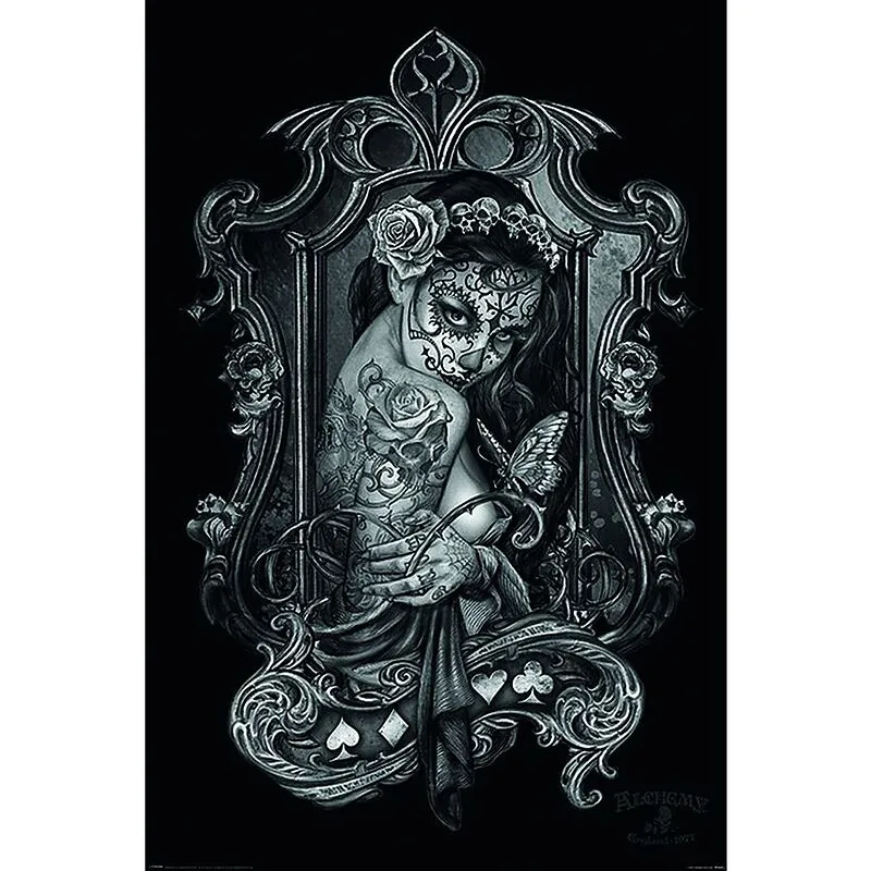Mystisches Poster mit einer tätowierten, hübschen Lady mit mexikanischer Totenmaske. Ein wundervolles Bild.Größe: Breite 61,0 cm Höhe 91,5 cm