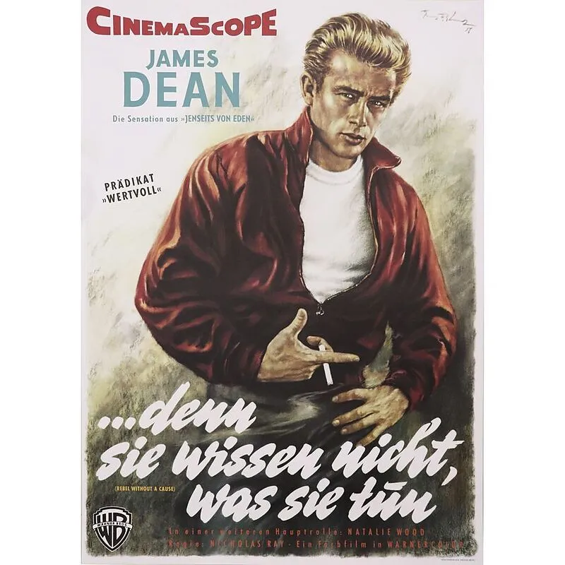 Deutsches FilmplakatFilmplakat "Denn Sie wissen nicht was sie tun, " mit James Dean in der Hauptrolle. Es war James Dean vorletzter Film. Er verstarb einen Monat vor der Uraufführung im Oktober 1955.Größe: Breite 59,3 cm Höhe 84,2 cm
