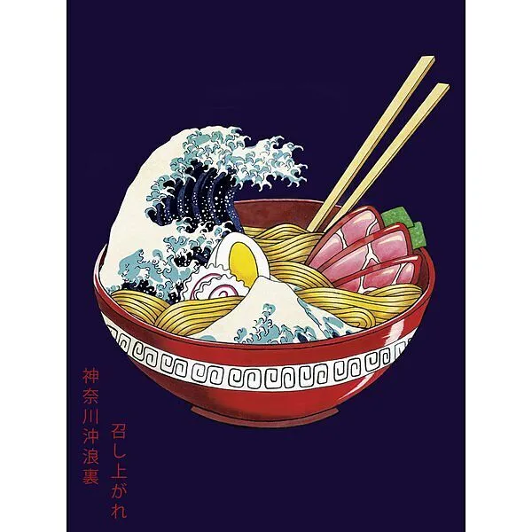 Papier 250 gr. matt Ein wundervoller Kunstdruck für Asia-Fans mit einer Prise Ironie. In einer traditionellen Schüssel befindet sich das leckere Gericht Ramen mit der bekannten Great Wave von Künstler Hokusai. Ein Mini Poster im Hochformat, das Appetit und Lau...