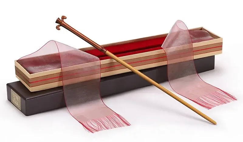 Authentische und offizielle Nachbildung von Gilderoy Lockhart's Zauberstab. Dieser Zauberstab aus Harz wird in einer Ollivander- Sammlerbox mit einem Samtetui präsentiert, das an die Form des Zauberstabs angepasst ist. Zwei Segel auf jeder Seite der Box bedeck...