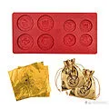 Beinhaltet: Schokoladen-Münzform (8 Mulden), 2 Beutel, 16 Folienpapiere und Anleitung Größe - Form: 21 cm x 21 cm x 1,5 cm , Beutel: 0,85 cm x 1 cm Materialien: Form: Silikon Papier: Aluminium Beutel: Polyester (innen) und PET (außen)