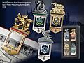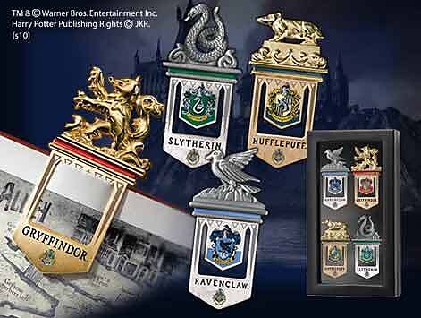 4 Lesezeichen, die die 4 Häuser darstellen: Gryffindor, Slytherin, Ravenclaw und Hufflepuff. Die Lesezeichen sind 24 Karat Gold und Silber. Sie messen ungefähr 5,5 cm in der Höhe und 3 cm in der Breite.
