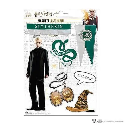 Bogen mit 7 Schaummagneten: Draco, Medaillon, sprechender Hut, Sprechblase "Slytherin", Slytherin Flagge- und Wappen, Slytherin Streamer, Schlange.15 x 21 cm