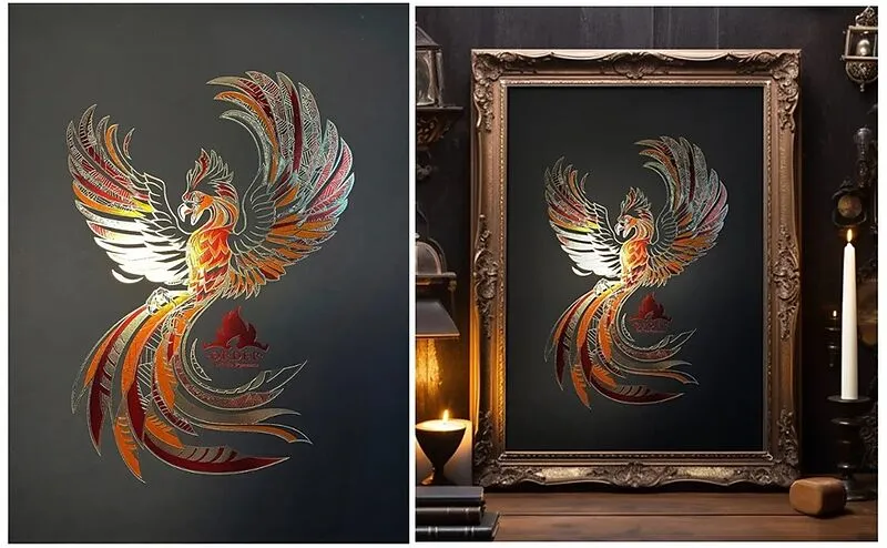 ohne Rahmen Orientierung: Hochformat Grösse: 30 x 40 cm Markierung: Heißprägung durch Druck Farbe: Gold, Metallrot, Metallorange Papier: Colorplan Ebonny (Schwarz) 350Gr/m2