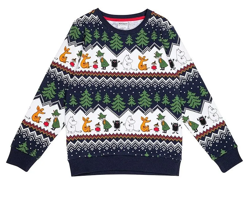Dieses langärmelige College-Shirt für Kinder in Dunkelblau hat eine bequeme Passform und ist innen weich angeraut. Es ist mit einem Bergmassiv, einem Wald und den Mumins bedruckt. Lange Ärmel Bequeme Passform Bündchen an Ärmeln und Saum Weich angeraute Innense...