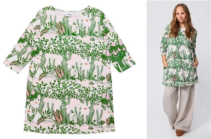 Grösse S Die rosa-grüne Tunika mit ®-Ärmeln und Taschen aus der Mumin- Kollektion präsentiert sich im stimmungsvollen "Spring Chestnut"-Print in Rosa- und Grüntönen, inspiriert von den Mumins und dem Buch "Mumins lange Reise von Tove Jansson. Das Model ist 165...