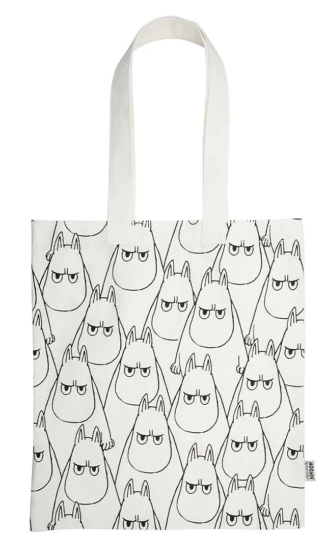 Die weiße Öko-Tasche hat stabile Henkel. Sie ist aus recycelter Baumwolle gefertigt und bietet Platz für Einkäufe und andere wichtige Dinge. Die Tasche ist 37 x 41 cm groß und auf einer Seite prangt ein sich wiederholender Aufdruck eines mürrischen Mumintrolls...