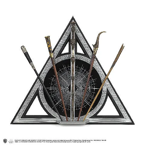 Offiziell lizenziertes Produkt Fantastic Beasts. Set mit 5 Zauberstäben (ohne einzelne Kisten) und einem wunderschönen Wanddisplay im Heiligtümer des Todes Look. Zauberstäbe: Theseus Scamander, Leta Lestrange, Gellert Grindelwald, Nicolas Flamel und Newt Scama...