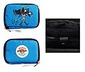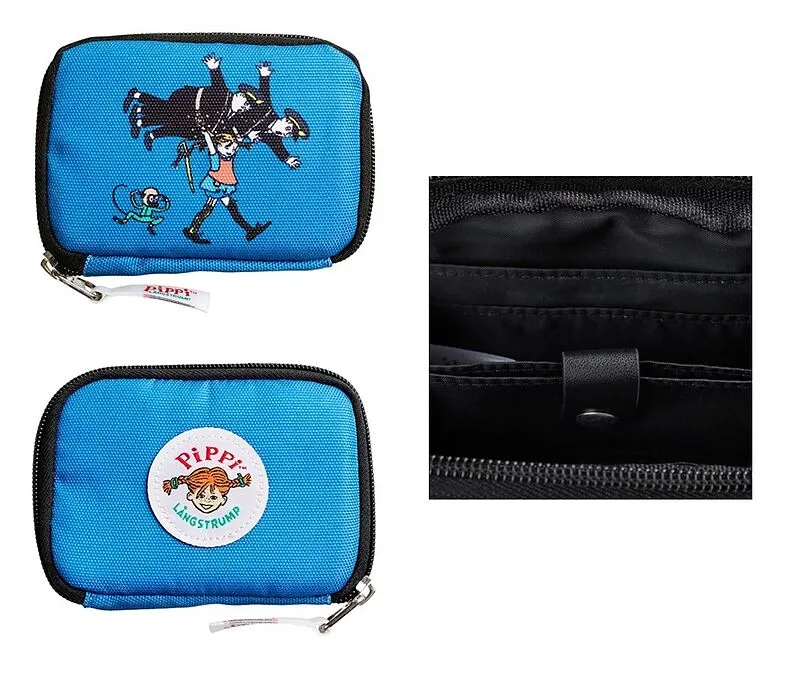 Die blaue Raisu Geldbörse hat separate Fächer und ein Fach mit Druckknopf. Sie hat einen Reißverschluss. Das Portemonnaie ist mit einem fröhlichen Motiv von Pippi Langstrumpf bedruckt, das Polizisten hochhebt. Eine kleine Geldbörse für Bankkarten, Quittungen, ...