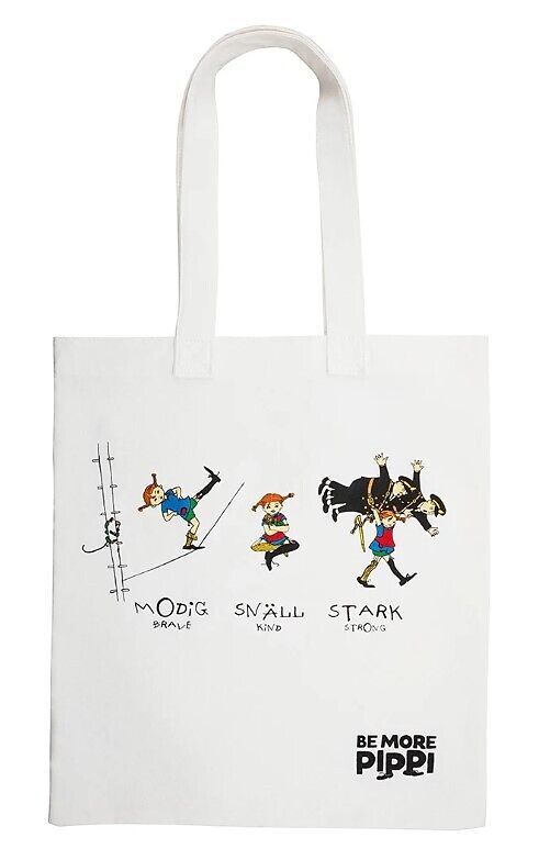 Die weiße Pippi-Öko-Tasche hat stabile Tragegriffe. Sie besteht aus recycelter Baumwolle und bietet Platz für Lebensmittel und andere wichtige Dinge. Die Maße der Tasche betragen 37 x 41 cm. Pippi Langstrumpf ist eine beliebte Figur aus der Feder von Astrid Li...