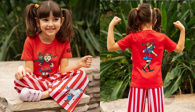 Das rote Kurzarm-T-Shirt für Kinder ist gerade geschnitten und mit einem Aufdruck von Pippi Langstrumpf und Herrn Nilsson auf Vorder- und Rückseite versehen. Auf dem Ärmel steht: "Be more Pippi!" Kurze Ärmel, Gerade geschnitten, Weicher Gummidruck Hergestellt ...
