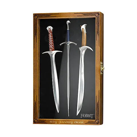 Schachtel mit 3 Brieföffnern mit: - Dart, das Schwert von Bilbo Beutlin - Glamdring, Gandalfs Schwert - Orcrist, das Schwert von Thorin Edelstahlklingen mit einer Größe von jeweils ca. 20 cm Glasierte Holzkiste (ca. 25x16cm) Darauf steht in goldenen Buchstaben...