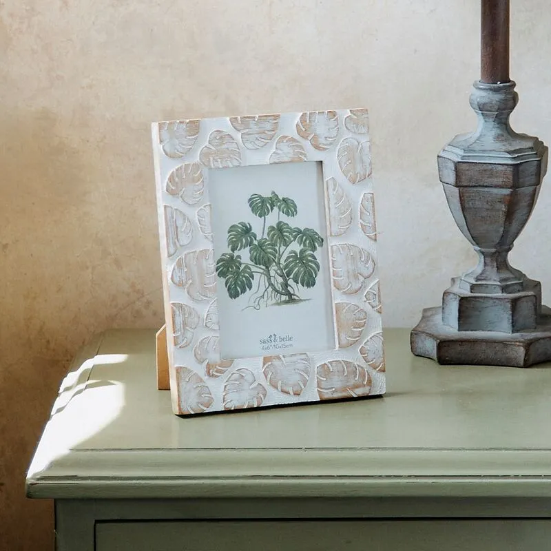 Dieser strukturierte stehende Fotorahmen aus Mangoholz zeigt ein hübsches Wiederholungsmuster aus Monsterablättern. 16 x 1.5 x 21.5 cm passend für Fotos mit 15 x 10 cm Grösse Material: Magoholz, Glas (ein Produkt von sass & belle)