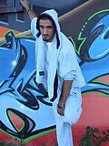 "Immortality of the Child in me" heisst dieser 3-Teiler (Hose, Jacke + Schal) aus 80% Baumwolle/20% Polyester.Schal misst 135 cm x 24 cm. Aus Samt in Top-Qualität, bei 30° waschbar.