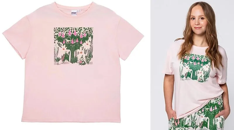 Grösse S Das rosa Kurzarm-T-Shirt aus der Mumin-Kollektion hat eine bequeme Passform und überschnittene Schultern. Es ist mit dem schönen "Spring Chestnut"-Print in Rosa- und Grüntönen versehen, der von den Mumins und dem Buch "Mumins lange Reise" von Tove Jan...