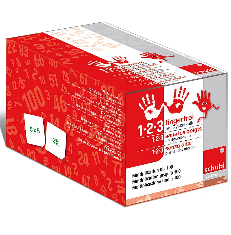 Inhalt: 200 Spielkarten (100 Kartenpaare) in stabiler Schiebeschachtel davon 100 Aufgabenkarten und 100 Ergebniskarten - 10 Registerkarten - Anleitung