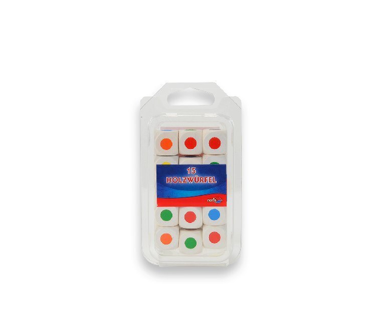 15 Ersatzwürfel aus Holz, 16 mm, im Doppelblister. Jeder Würfel hat folgende 6 Farben: blau, rot, grün, orange, gelb und violett.