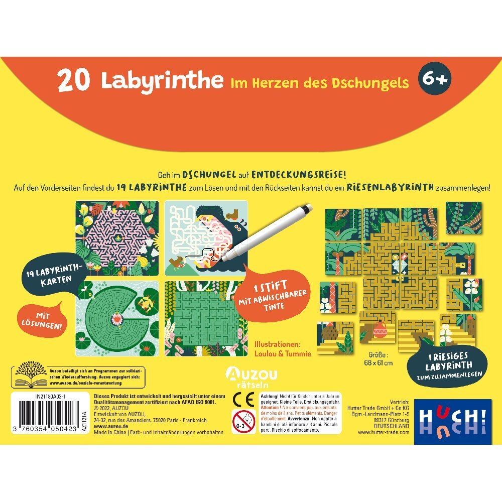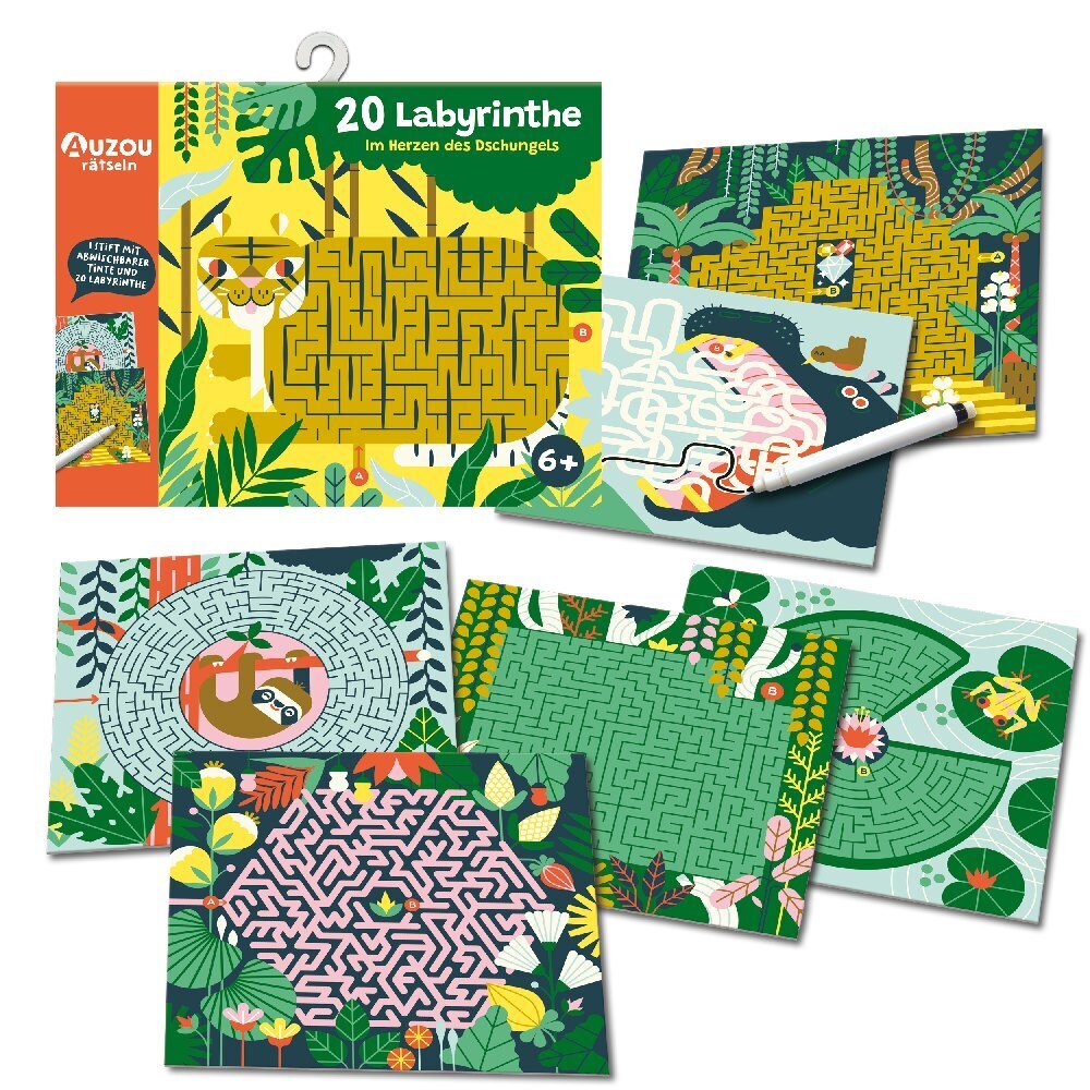 Geh im Dschungel auf Entdeckungsreise! Auf den Vorderseiten findest du 19 Labyrinthe zum Lösen und mit den Rückseiten kannst du ein Riesenlabyrinth zusammenlegen!