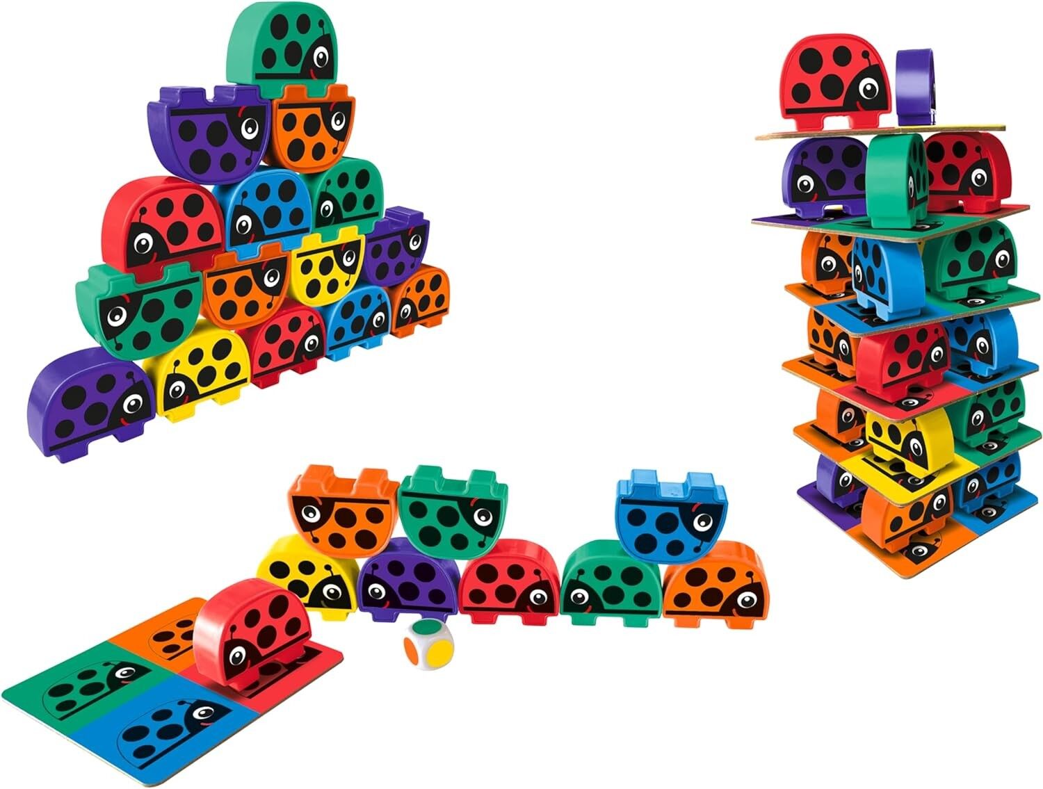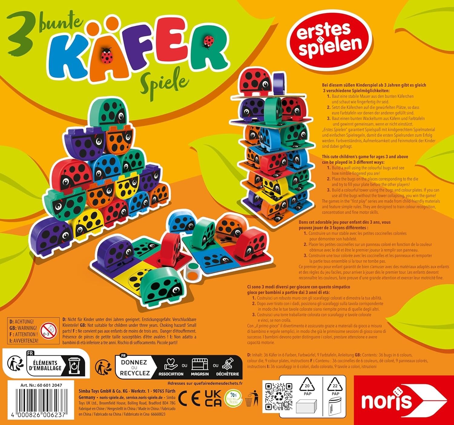 Bei diesem süßen Kinderspiel ab 3 Jahren gibt es gleich 3 verschiedene Spielmöglichkeiten: 1. Mein rechter, rechter Platz ist leer: Die Kinder setzen Käferchen in der gewürfelten Farbe auf die entsprechenden Farbfelder ihrer Farbtafeln. Wer seine Farbtafeln zu...