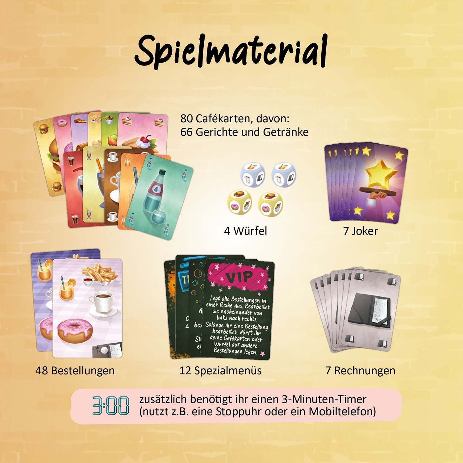 Viel los im Crazy Caf! Innerhalb von drei Minuten werden hier die Bestellungen vervollständigt. Dafür legen Spielerinnen und Spieler ab sieben Jahren Handkarten und Würfel auf den Bestellungen ab. Genaue Absprachen sind gefragt, damit kein Gast hungrig bleibt!...