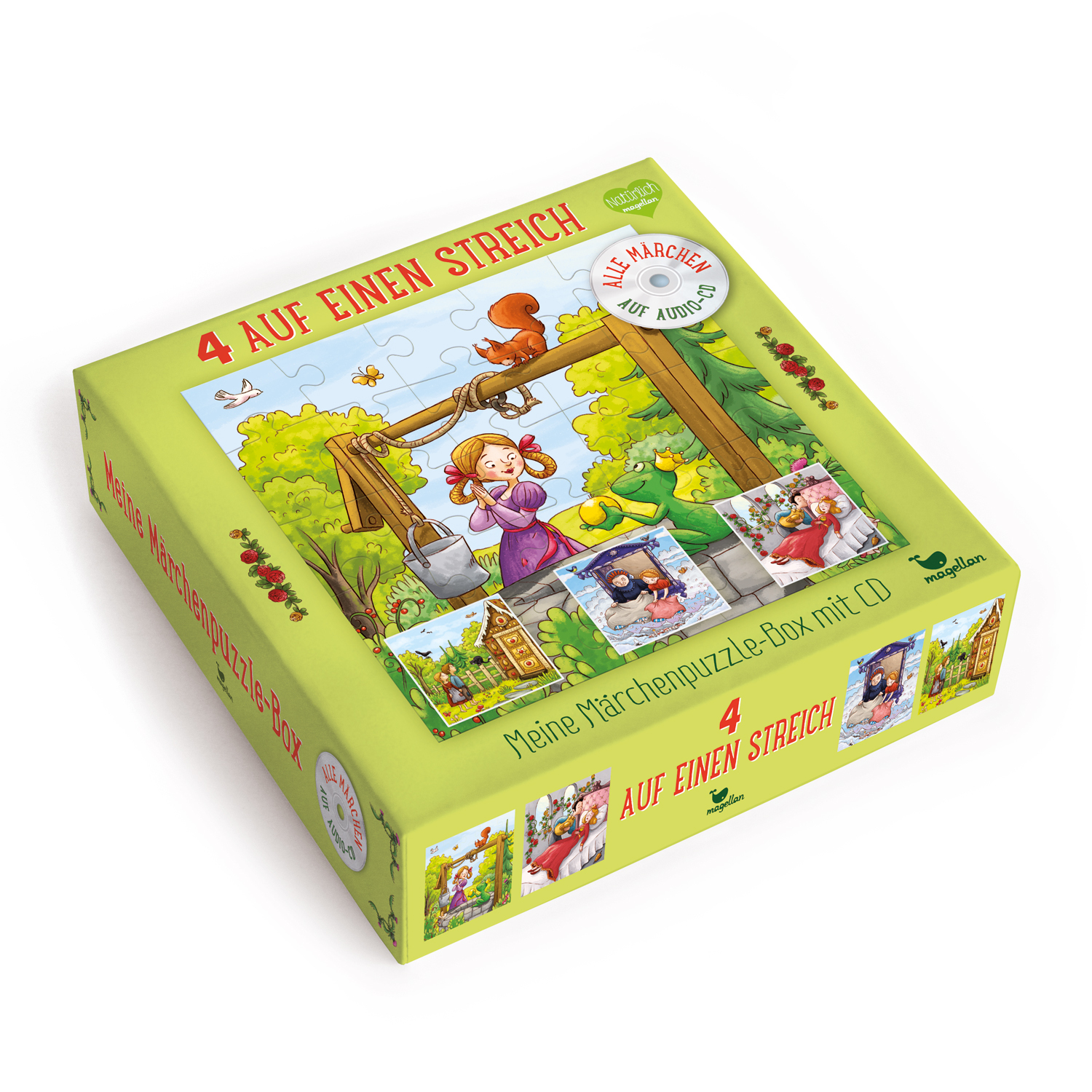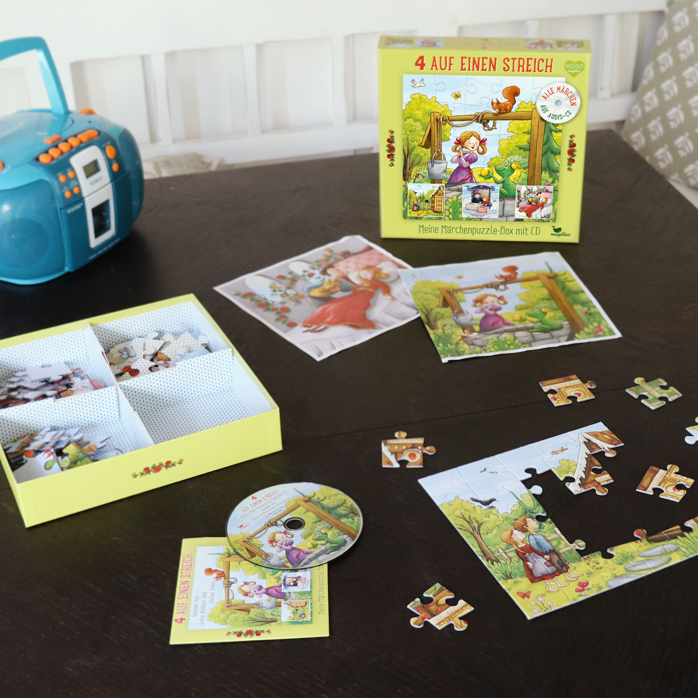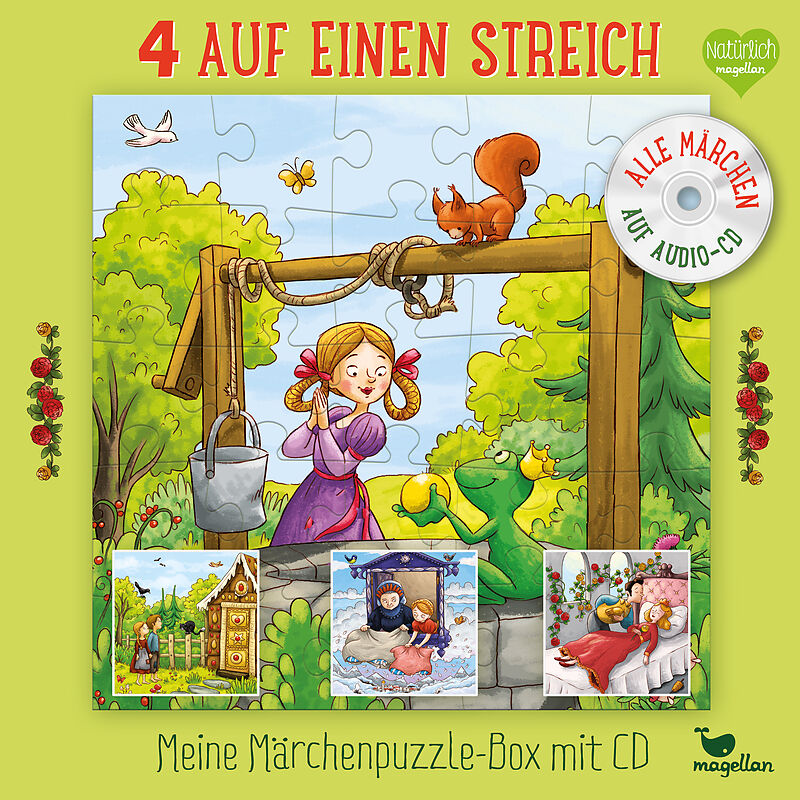 Hier wird gepuzzelt und den Geschichten gelauscht! Vier beliebte Märchenklassiker als Puzzle und eine begleitende Audio-CD entführen in Grimms Märchenland: Besucht werden der Froschkönig am Brunnen, Frau Holle in den Wolken, Hänsel und Gretel im Wald und Dorn...