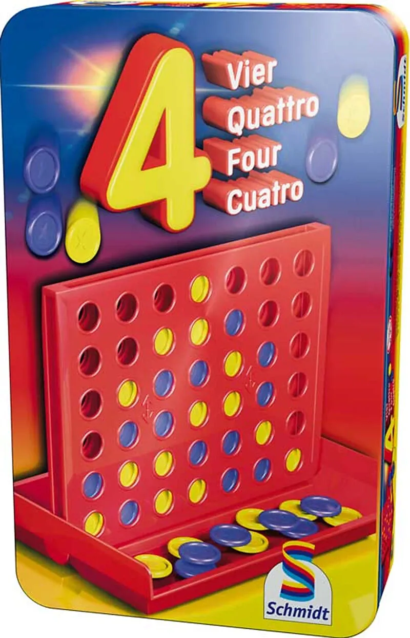 Schmidt Spiele Vier Mitbringspiel in der Metalldose Wer schafft es zuerst, 4 Chips seiner Farbe in eine Reihe zu bringen? Da kann man den Gegner in die Falle locken. Doch Achtung, nicht dass man ihm auf den Leim geht. Verblüffend einfach und spannend. Das Gehi...