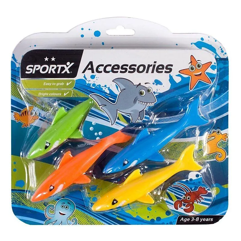 Tauchhaie 4 Stück. Werfen Sie sie ins Wasser und tauchen Sie nach ihnen! Helle Farben und leicht zu handhaben. Geeignet für Kinder von 3 bis 8 Jahren.