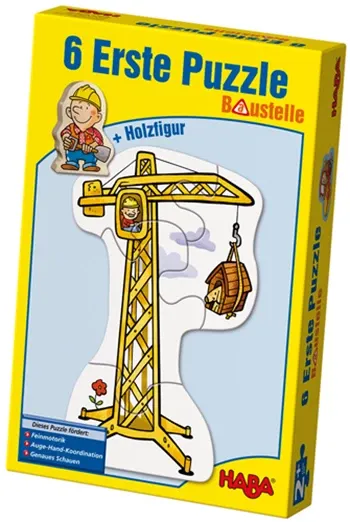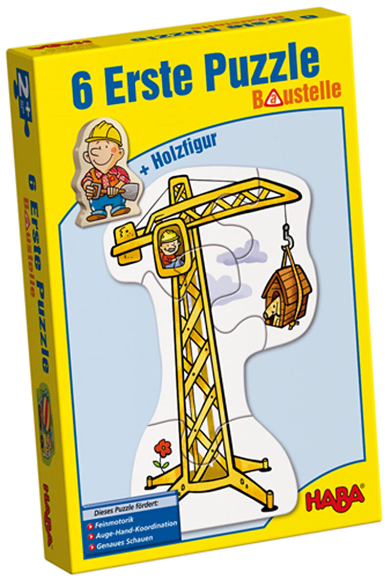 Große Teile für kleine Hände. 6 tolle Motive zum Zuordnen. Mit Holzfigur zum freien Spiel. Dieses Spiel fördert Feinmotorik, Auge-Hand-Koordination, genaues Schauen. Auf der Baustelle ist eine Menge los! Das Set 6 erste Puzzles Baustelle von HABA enthält 6 lus...