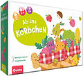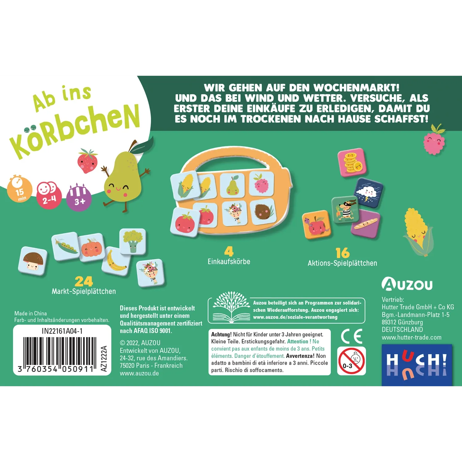 Inhalt: 24 Markt-Spielplättchen, 16 Aktions-Spielplättchen, 4 Einkaufskörbe