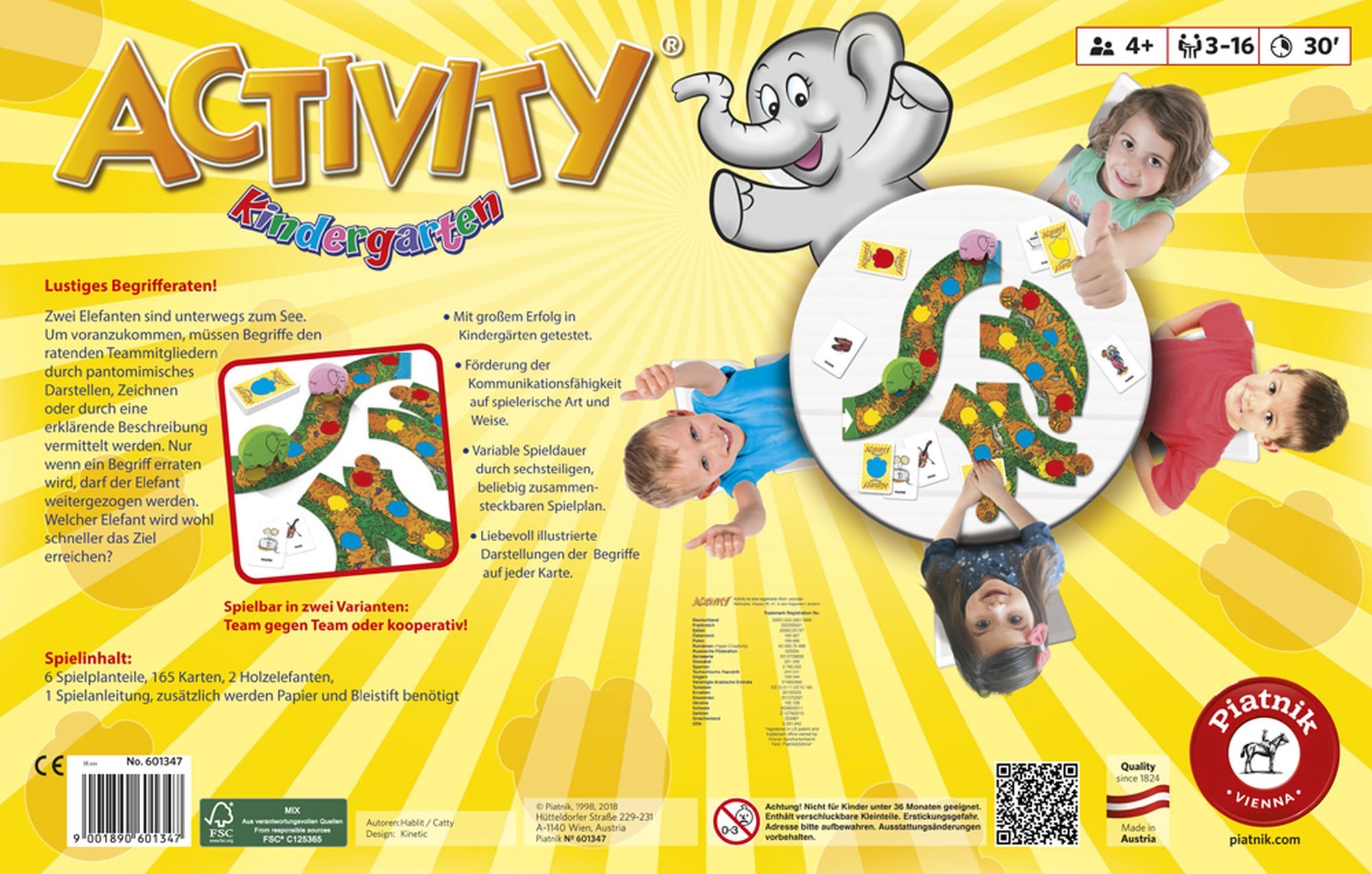 Piatnik 6013 Activity Kindergarten Der Spielspaß für die Kleinsten! Diese Kombination von kreativen Spielelementen wurde in Kindergärten mit großem Erfolg getestet. Die Fragen sind in verschiedene Kategorien eingeteilt, die individuell auf die Fähigkeit der Ki...