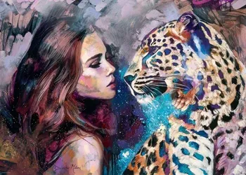Die Bilder der amerikanischen Künstlerin Dimitra Milan zeigen, in romantischen Träumen ist alles möglich vor allem eine innige Seelenverwandtschaft mit wilden Tieren. Gelegte Größe: 70x50 cm.
