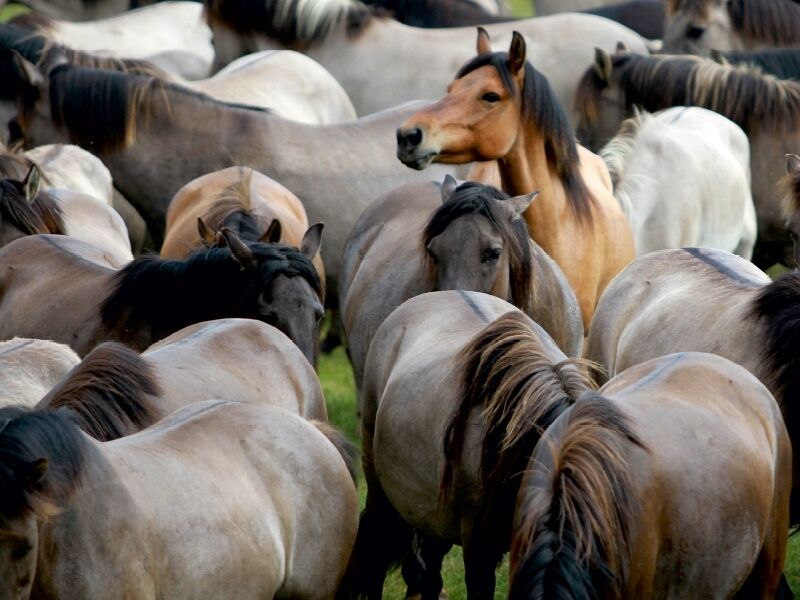 Dülmener Wildpferde gehören zu den letzten freilebenden Wildpferden. Im Meerfelder Bruch leben sie weitestgehend ohne Einwirkung von Menschenhand. Schön zu sehen wie die Herde funktioniert - einer passt immer auf! Ein Blickfang für jeden Pferdefreund!