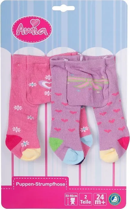 Amia Puppen-Strumpfhose für Puppen von Größe 28 bis 33 cm geeignet. Inhalt 2 Stück. Größe der Strumpfhose ca. 13x17,3x0,50 cm. Für Kinder ab 24 Monaten.