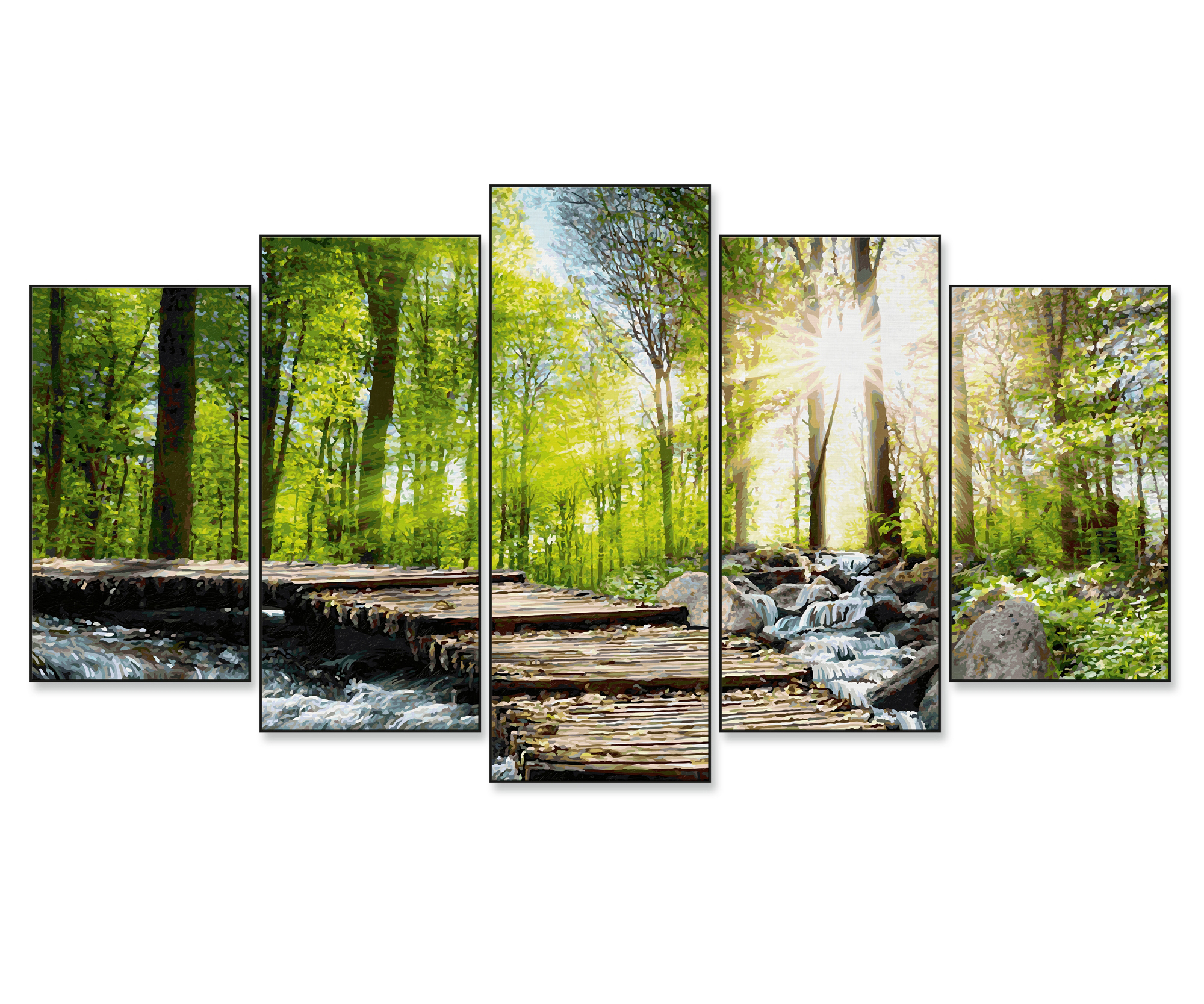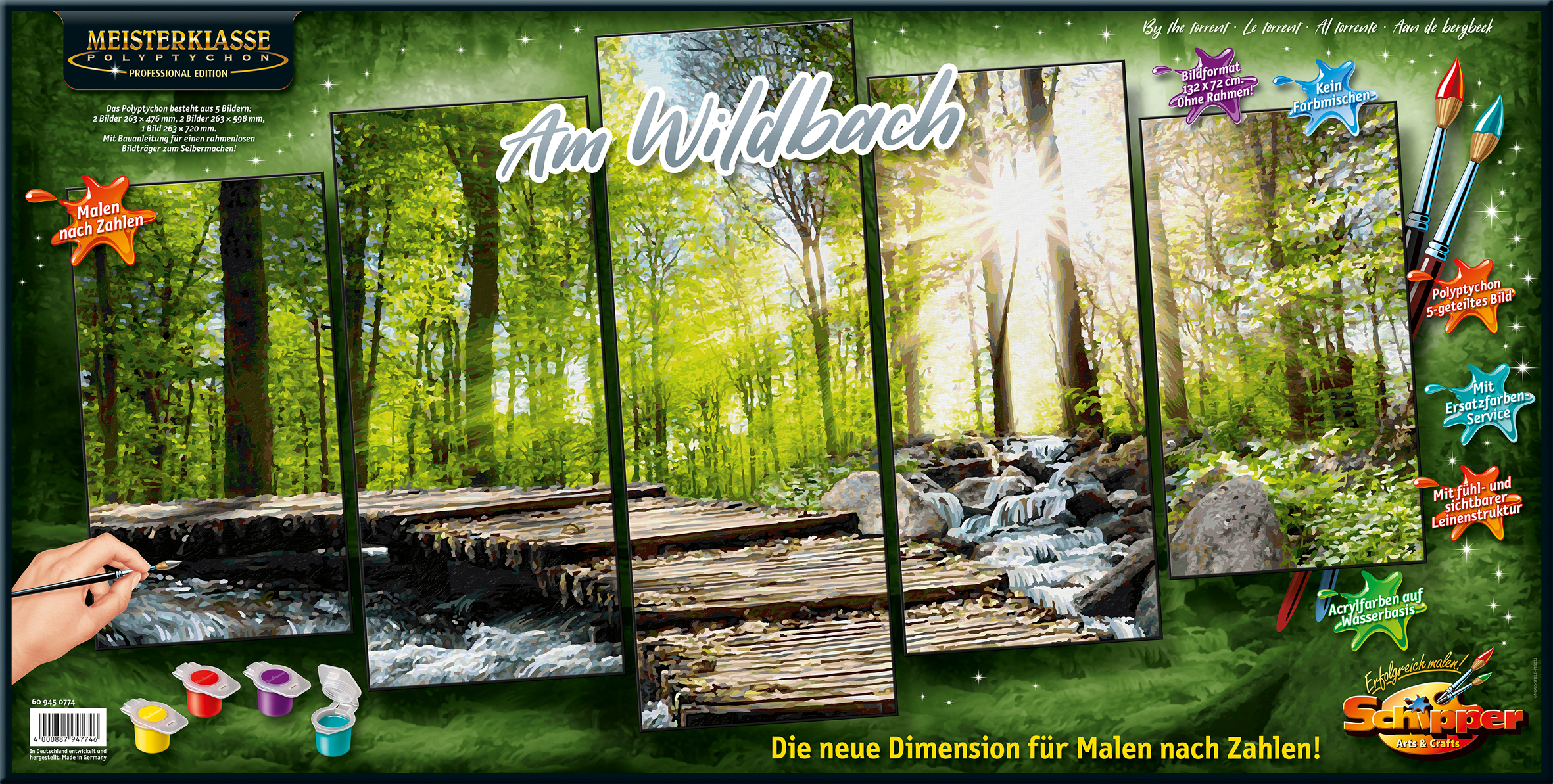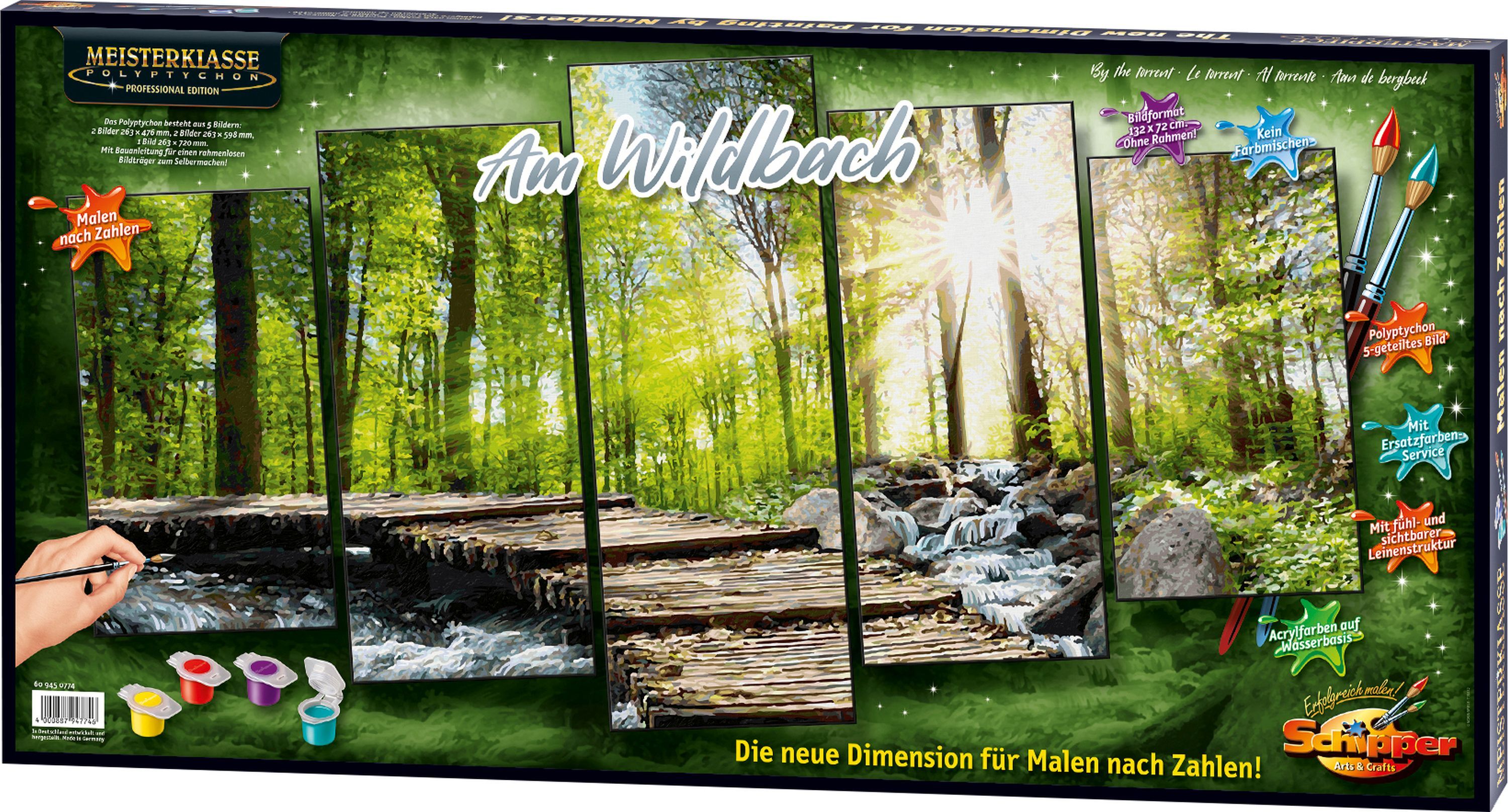 Malen nach Zahlen - Am Wildbach Schipper - Meisterklasse Polyptychon Die Größe allein beindruckt den Betrachter des 5-teiligen Polyptychons ''Am Wildbach''. Es zeigt eine die Seele berührende Landschaft in den Farben eines Sommertages. Die Sonne blinzelt durch...