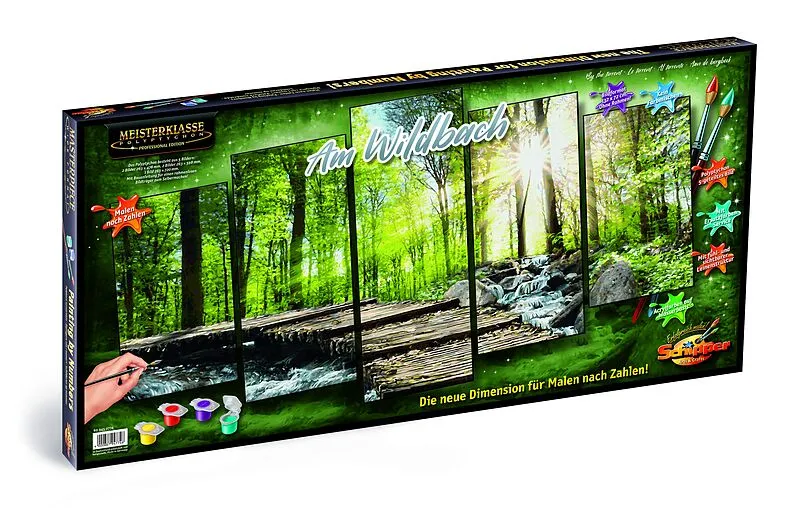 Malen nach Zahlen - Am Wildbach Schipper - Meisterklasse Polyptychon Die Größe allein beindruckt den Betrachter des 5-teiligen Polyptychons ''Am Wildbach''. Es zeigt eine die Seele berührende Landschaft in den Farben eines Sommertages. Die Sonne blinzelt durch...