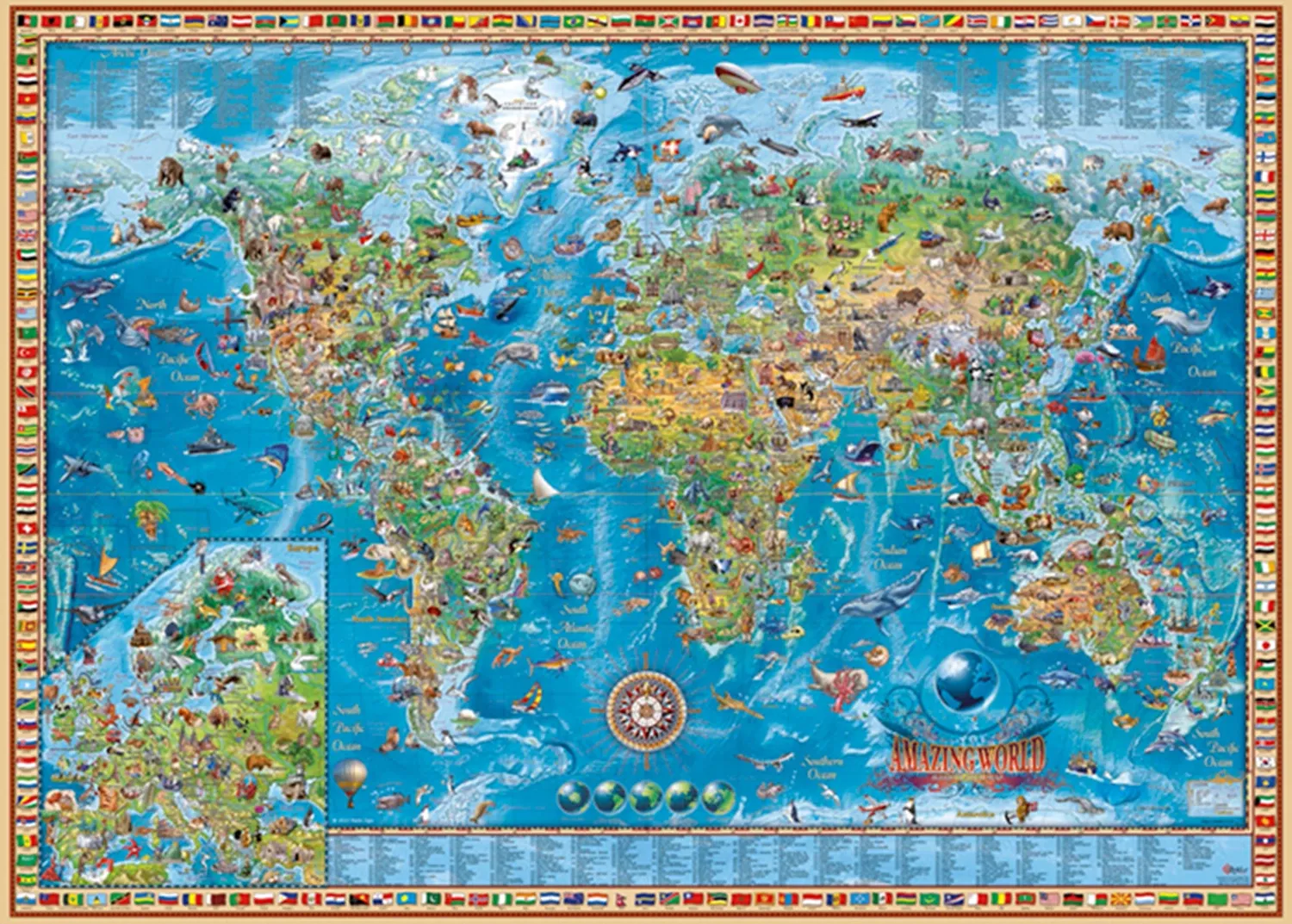 World Puzzles sind aufwendig und detailreich gestaltet, mit Fokus auf geografische Besonderheiten, Informationen und lehrreichen Extras. Gelegte Größe: 96.6x68.8 cm.