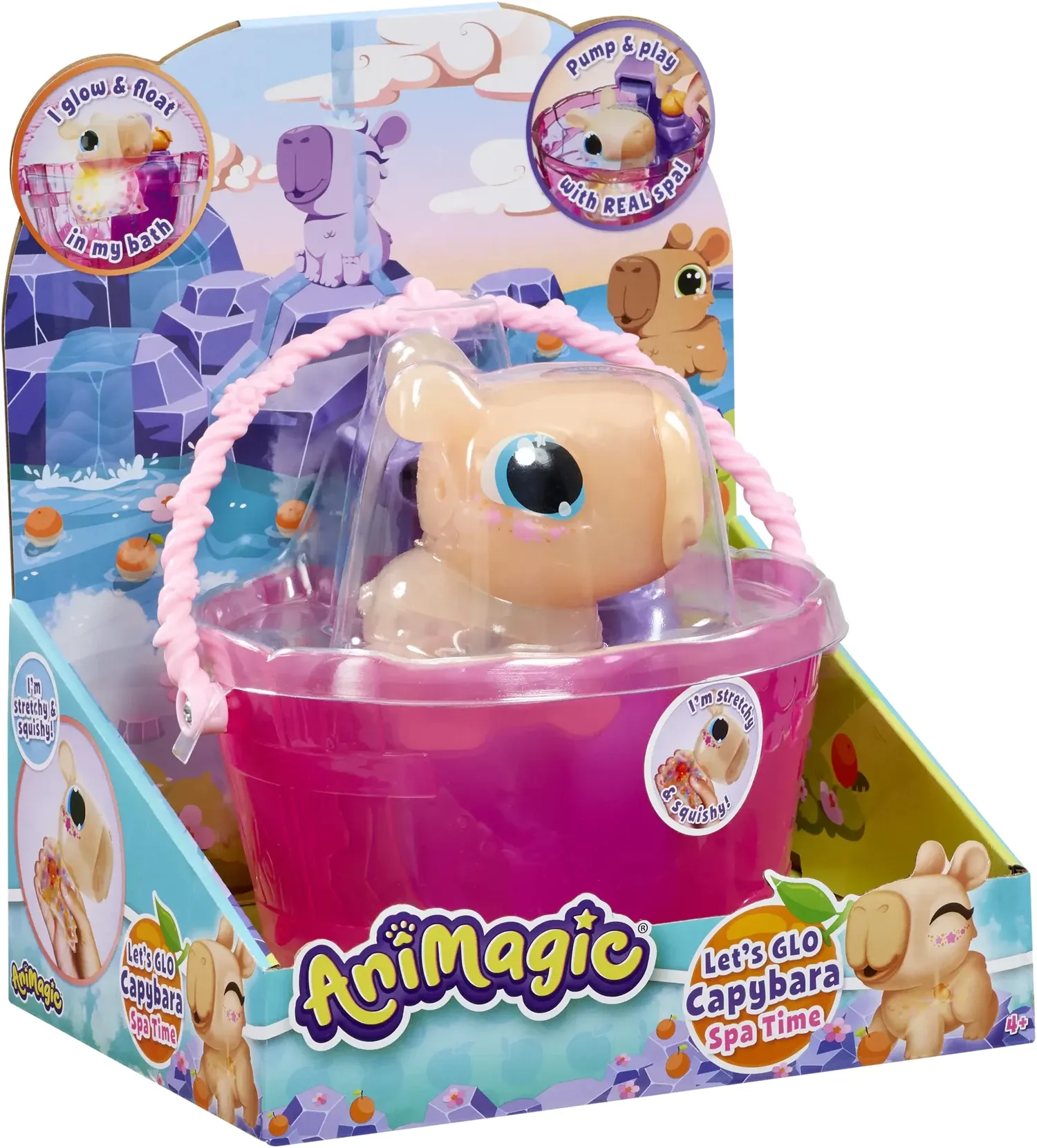 Das Let s Glo Capybara begeistert mit seinem Glow-Effekt im Wasser. Es hat einen weichen, kuscheligen Körper, gefüllt mit Perlen. Fülle den Eimer mit Wasser und drücke auf den Mandarinenknopf, damit das Capybara einen Wasserstrahl spritzt.