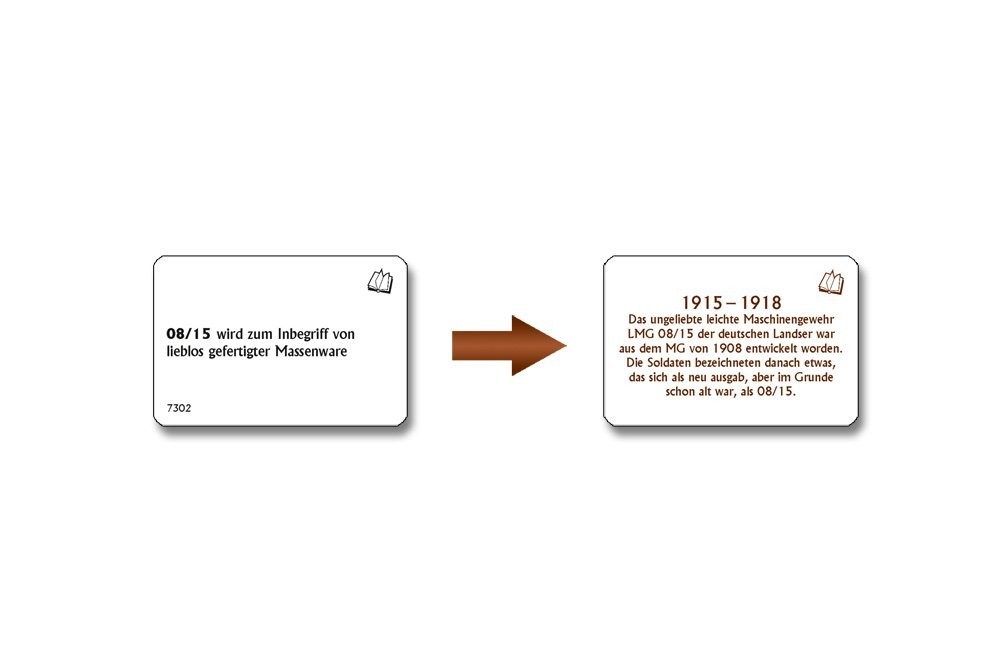 Bei diesem Kartenspiel müssen Ereignisse in die richtige zeitliche Abfolge gebracht werden. Es gilt also nicht Fragen zu beantworten, sondern zu entscheiden, ob etwa »08/15 zum Inbegriff von lieblos gefertigter Massenware wird« bevor oder nachdem »die Amerikan...