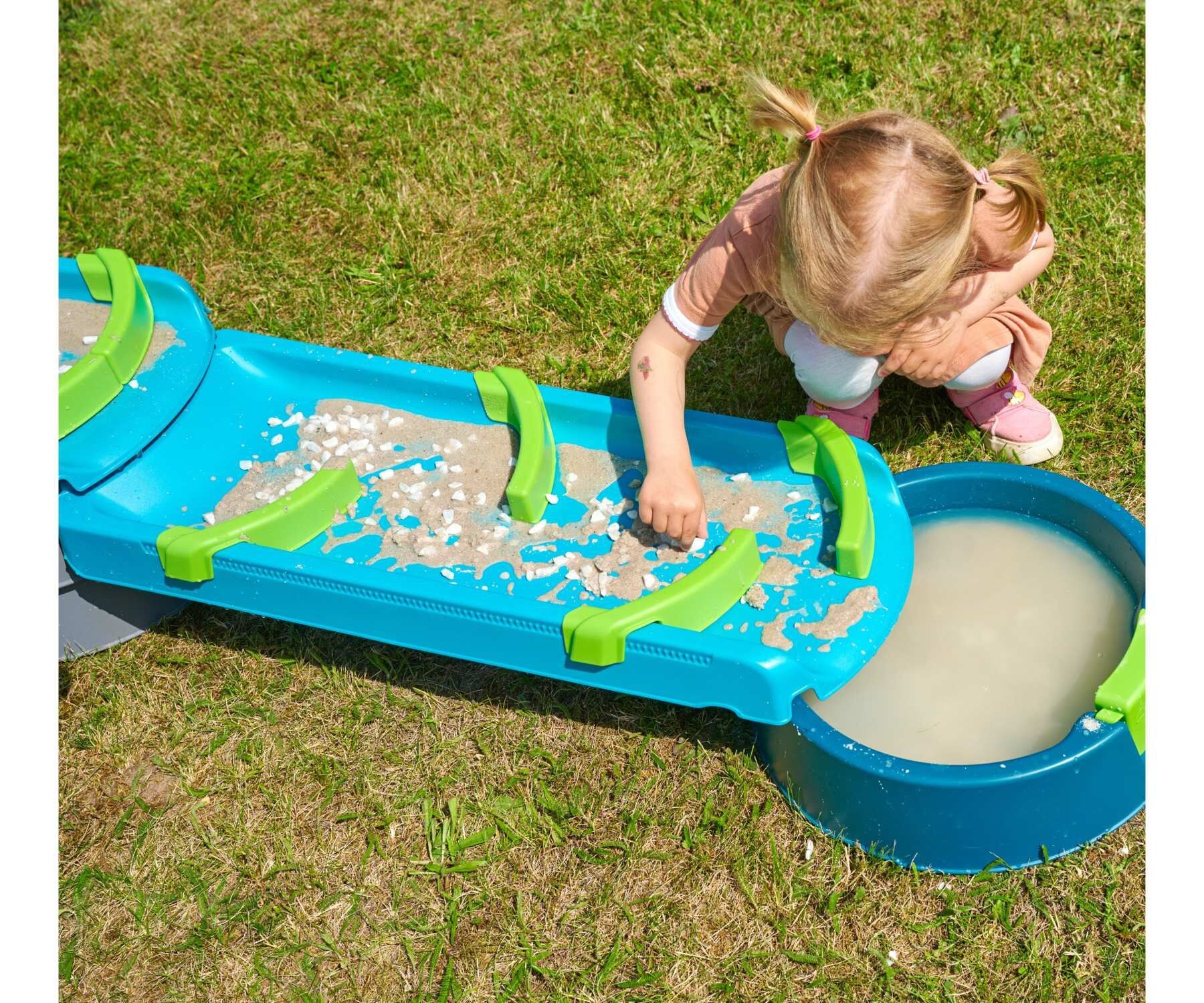 Mit dem AquaPlay Mudway Stream entdecken Kinder ab 3 Jahren auf spielerische Weise das Element Wasser und können die Eigenschaften unterschiedlicher Naturmaterialien erforschen. Maße aufgebaut: 300 x 38 x 65 cm Die Kombination aus Wasserbahn und Sandspielsyste...
