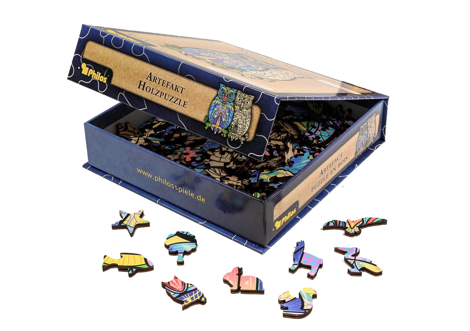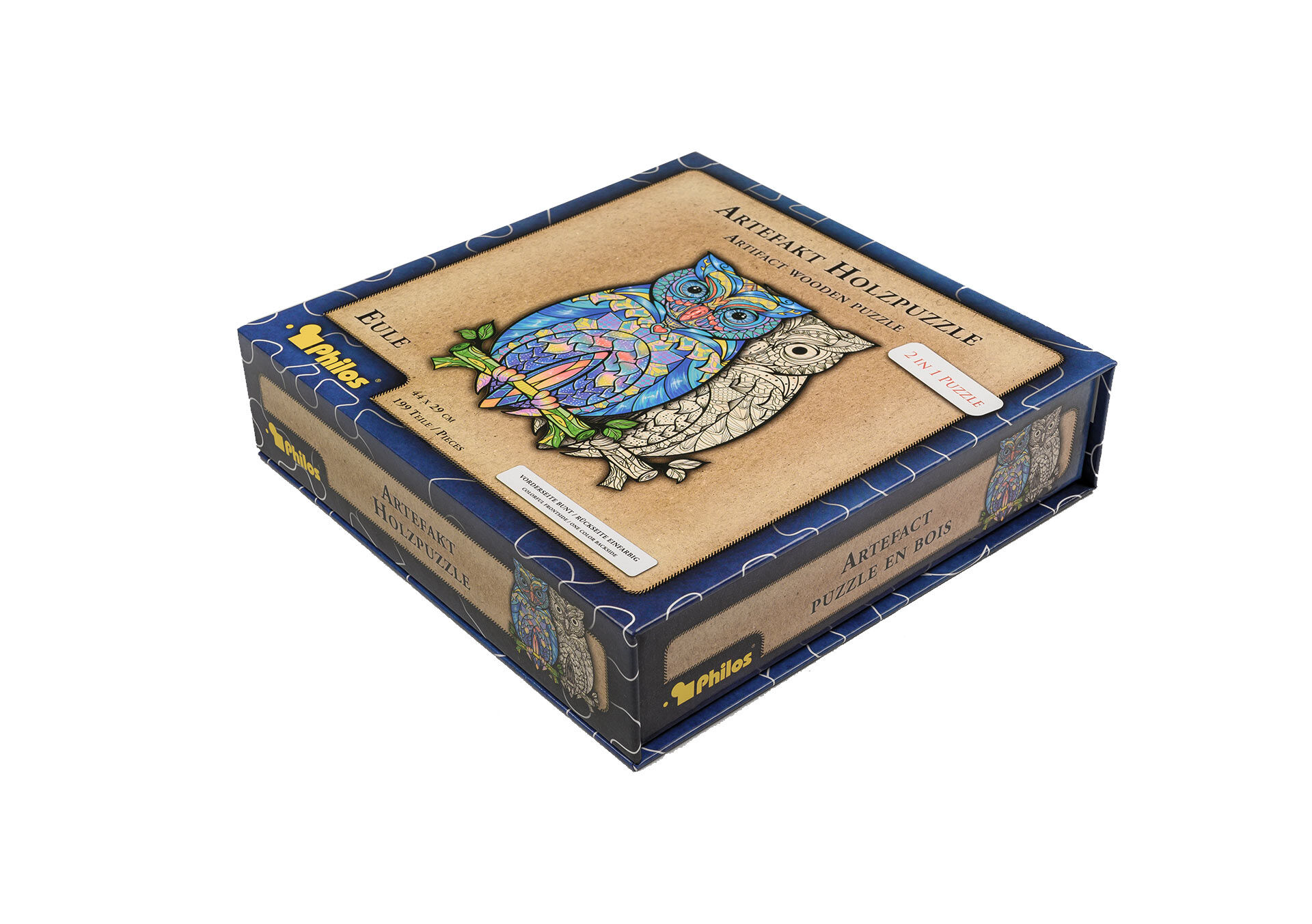 Artefakt Holzpuzzle 2 in 1 Eule, 199 Teile in magnetischer Klappschachtel. Maße L/B/H in mm 220 x 220 x 55 mm Unsere Artefakt Holzpuzzles eignen sich hervorragend für Jung und Alt. Die interessanten und künstlerisch gestalteten Motive bereiten jede Menge Spass...