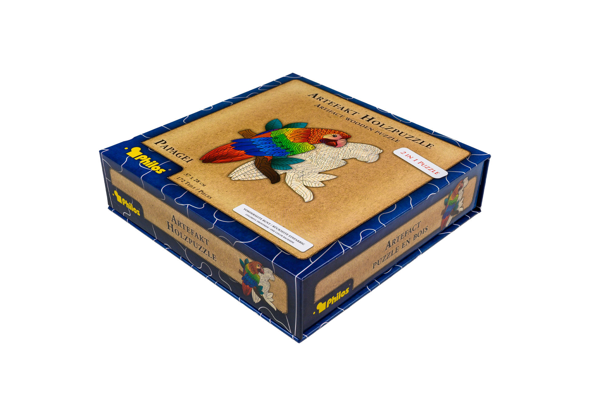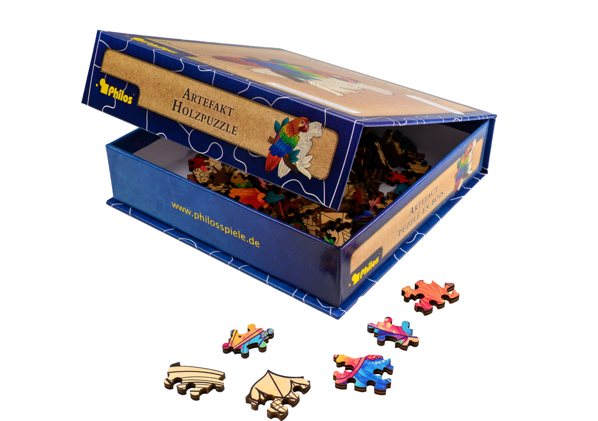 Artefakt Holzpuzzle 2in1 Papagei, 172 Teile in magnetischer Klappschachtel. Maße Spiel: 370 x 280 x 5 mm Maße Verpackung: 220 x 220 x 55 mm Unsere Artefakt Holzpuzzles eignen sich hervorragend für Jung und Alt. Die interessanten und künstlerisch gestalteten Mo...