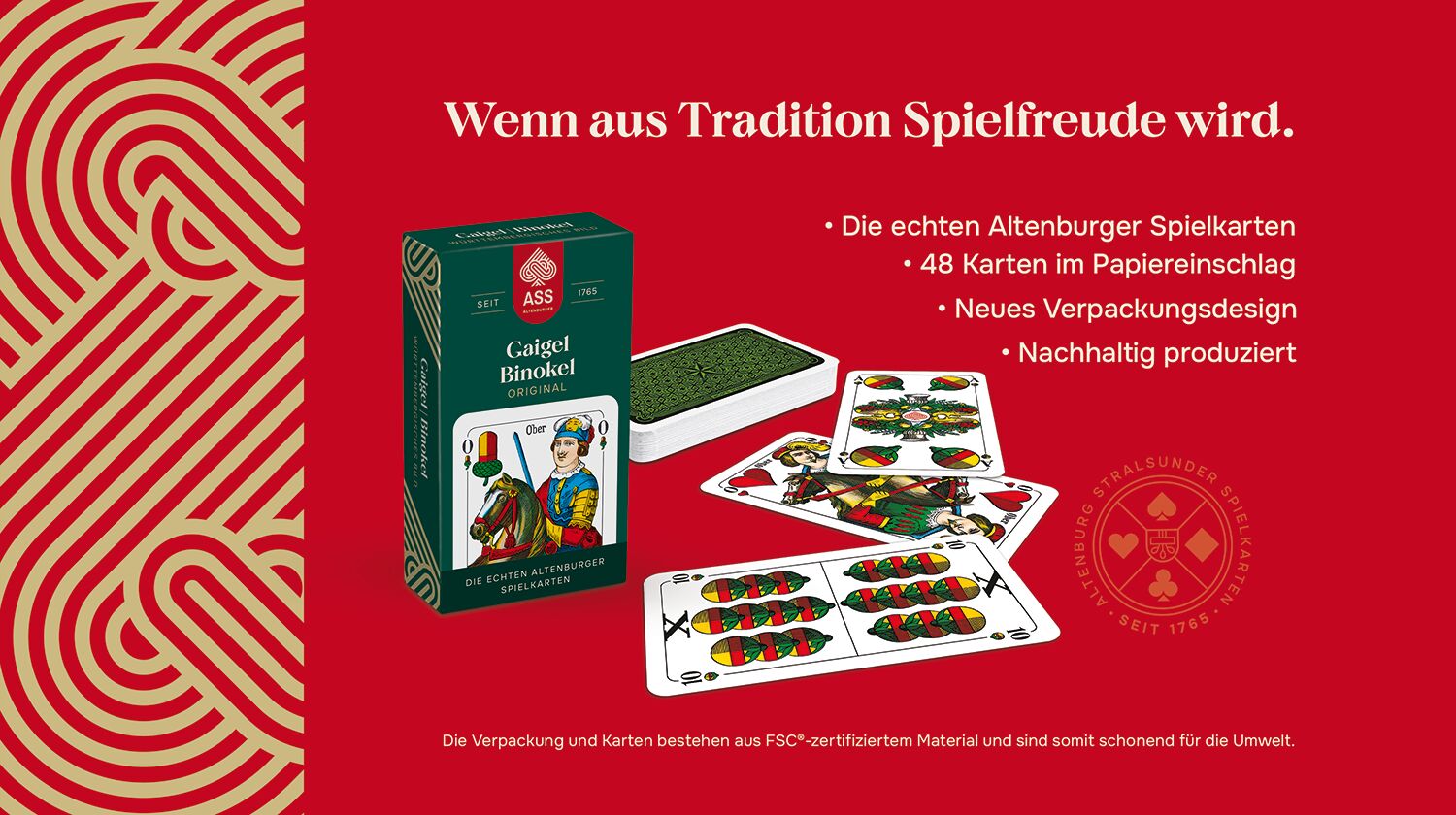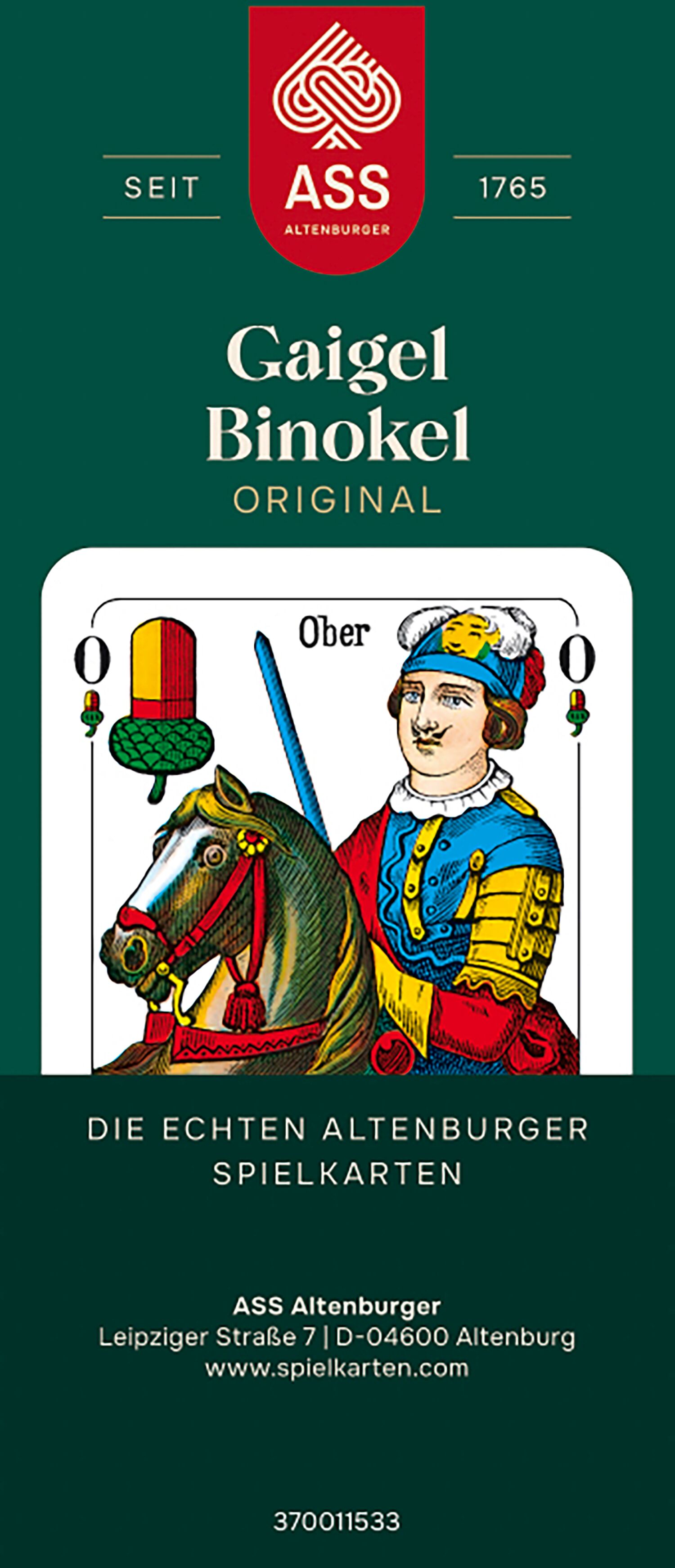Gaigel/Binokel, württembergisches Bild in Faltschachtel Gaigel und Binokel, das Spiel für 2-6 Spieler mit Württembergischem Bild. Weit verbreitet bei den Schwaben, sind Köpfchen und Gedächtnis gefragt.ASS Altenburger ist das älteste bekannte Unternehmen in der...