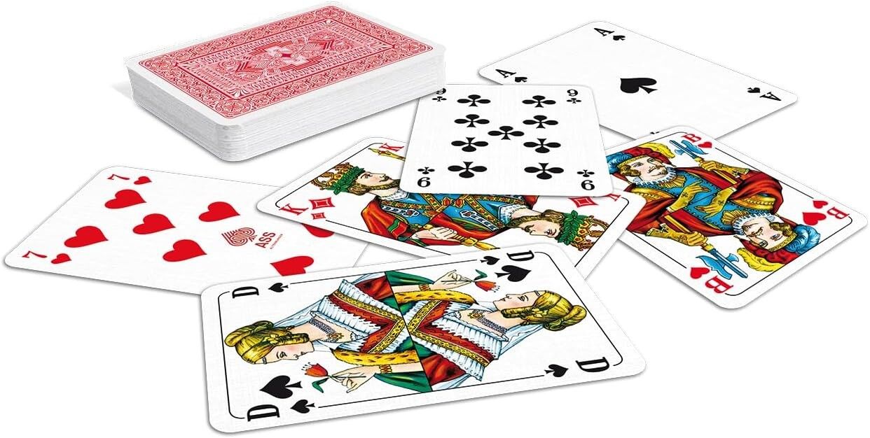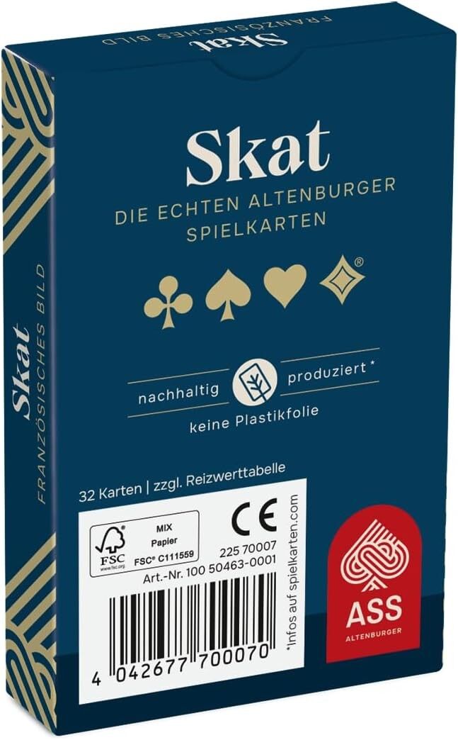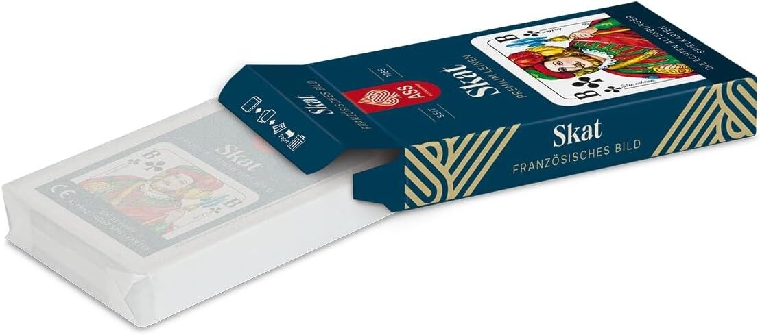 Das Skat französisch Bild in Faltschachtel enthält insgesamt 33 Karten (59x91 mm), darunter 32 Karten für das Skatspiel und 1 Deckblatt. Diese hochwertigen Karten sind ideal für Skatspieler, die das französische Kartenbild bevorzugen und eine umweltfreundliche...