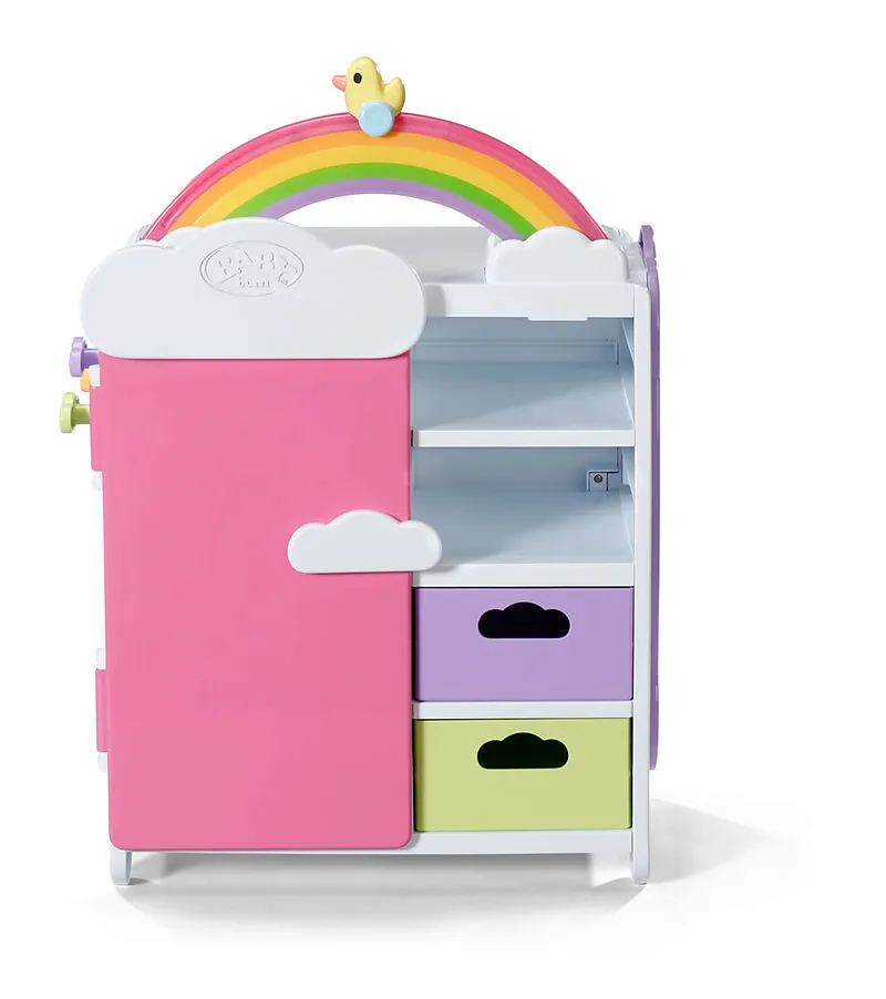 BABY born Regenbogen Schrank Mit dem BABY born Regenbogenschrank macht umziehen richtig Spaß! Während Ente Berta über den Regenbogen geschoben wird, leuchtet er auf. Berta spielt dazu eine fröhliche Melodie, die für gute Laune beim heraussuchen des heutigen Ou...