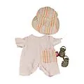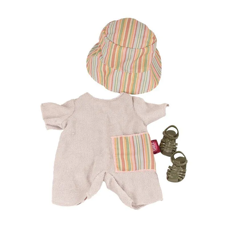 Ein stilvolles Sommer-Set für Babypuppen: Der weiche Frottee-Anzug bietet hohen Tragekomfort und sorgt an warmen Tagen für eine ansprechende Optik. Der gestreifte Sonnenhut schützt zuverlässig vor Sonneneinstrahlung, während die passenden Sandalen die Kombi ha...